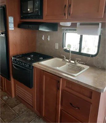Hardly used toy hauler, garage size:10’x8′, LED lighting, 200 watts solar, 2) 12volt batteries, air-conditioning, full shower, small tub, electric( awning, stabilizer jacks. tougue lift). Nor-cold fridge/freezer, 3 burner stove, oven, tv, radio, lots of storage.