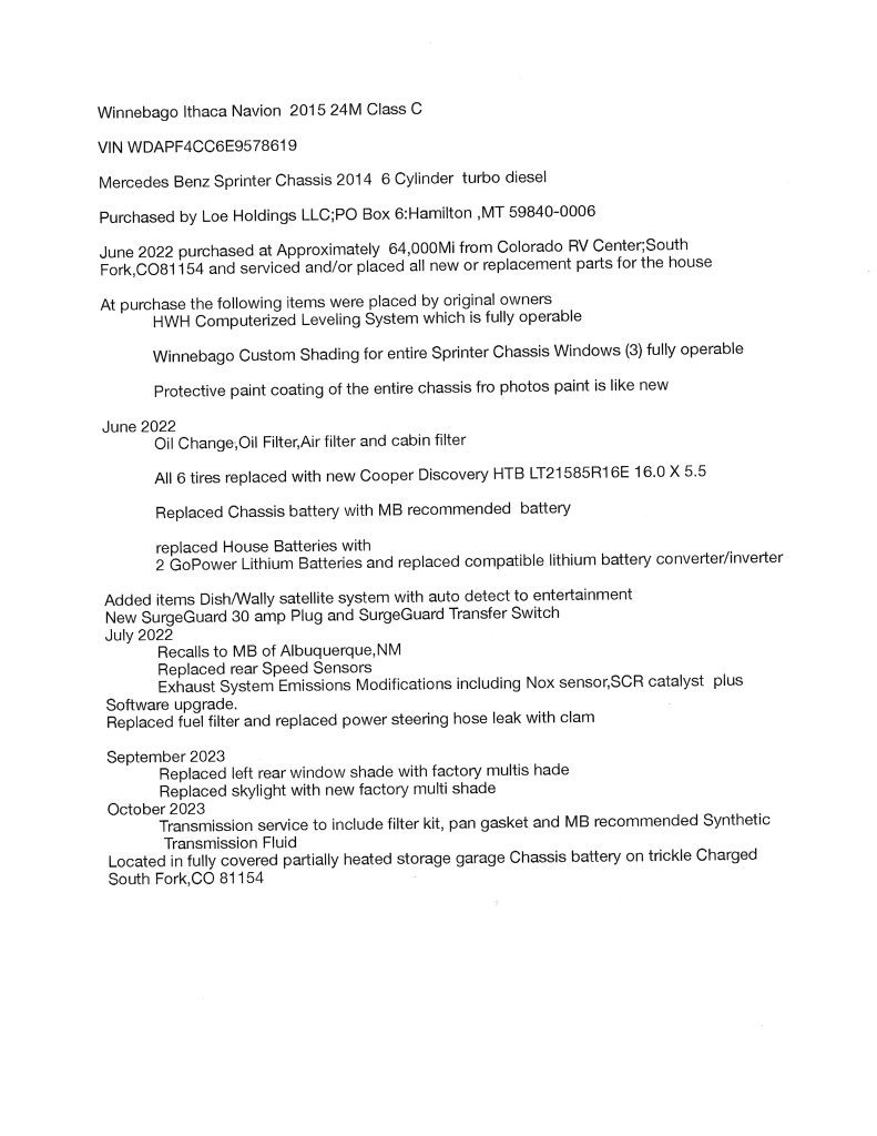 Mercedes Benz Sprinter Chassis 2014 6 Cylinder Turbo Diesel engine.