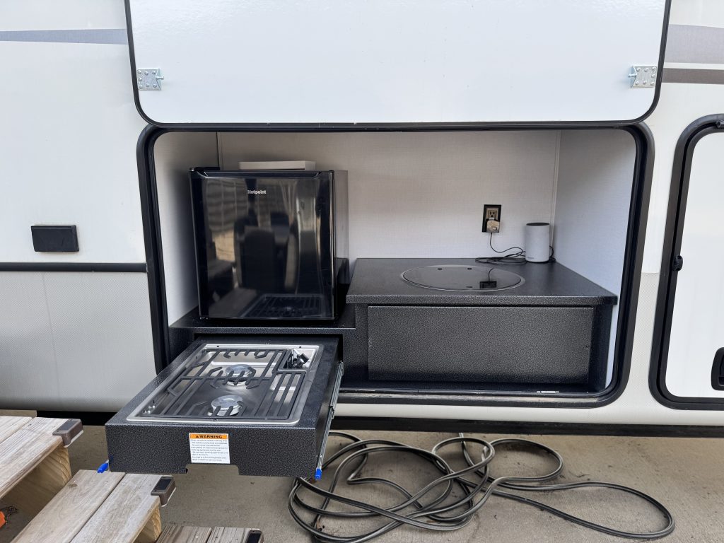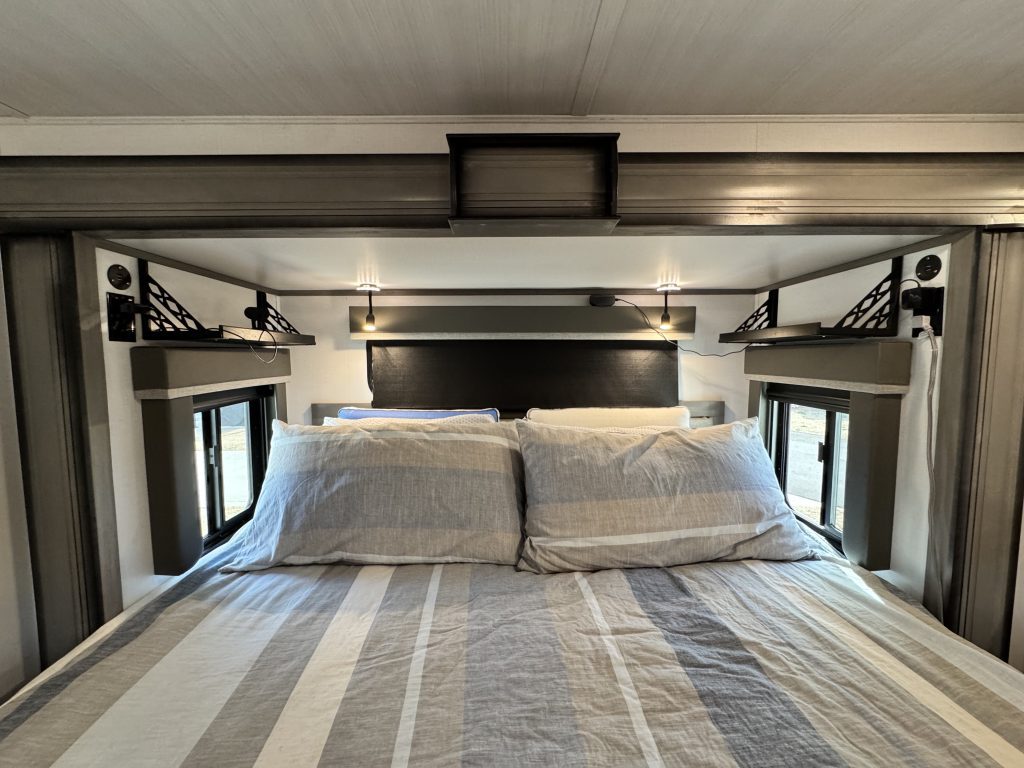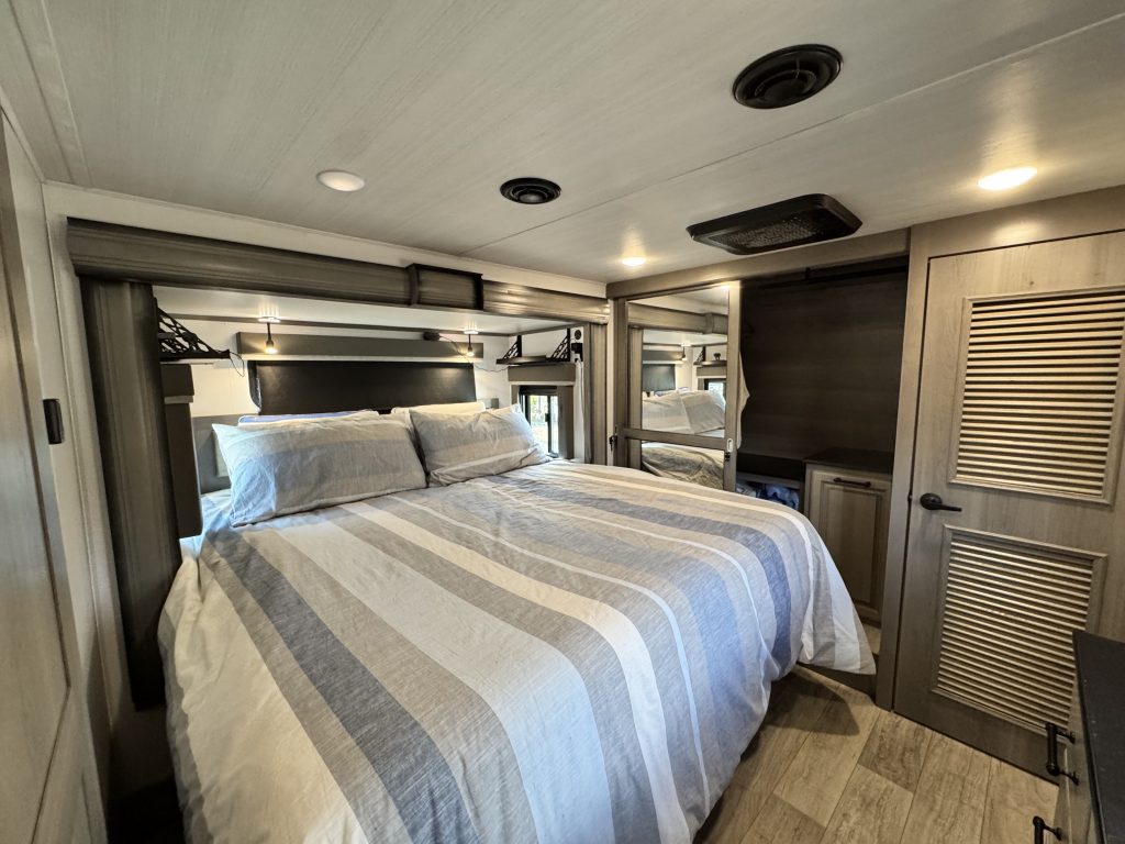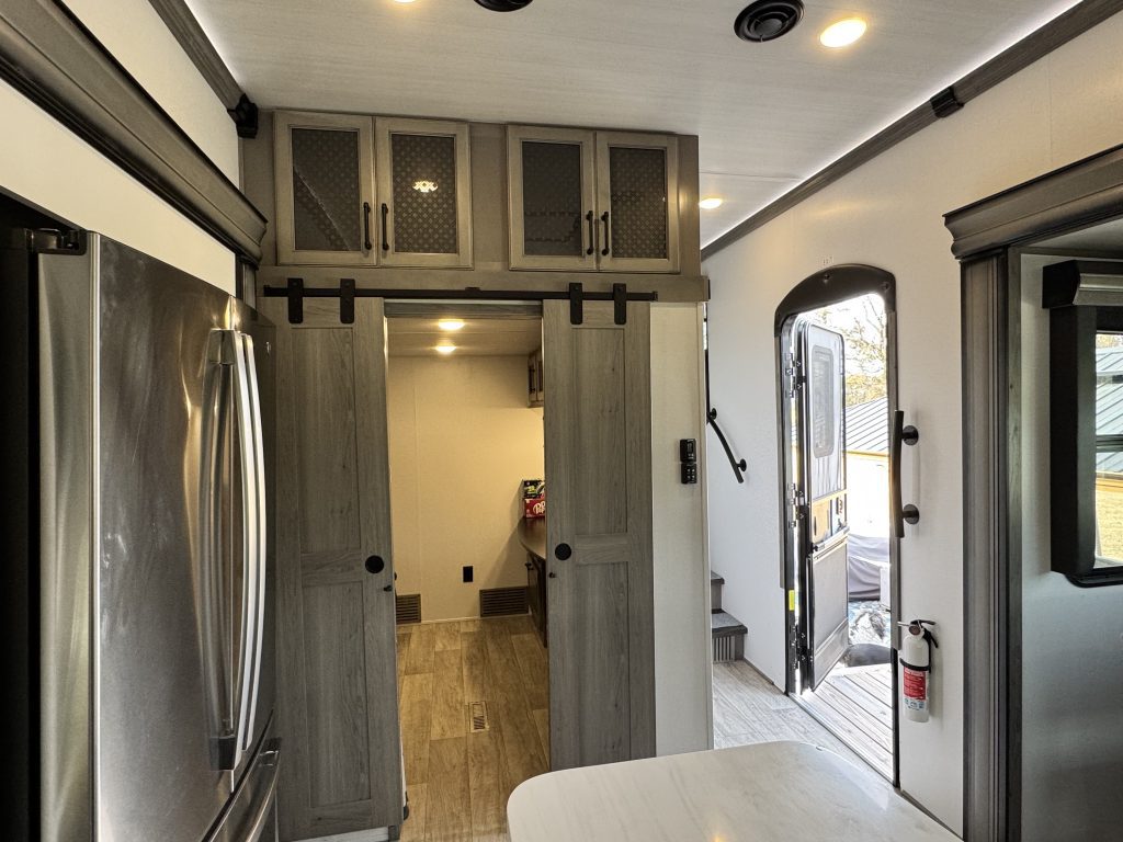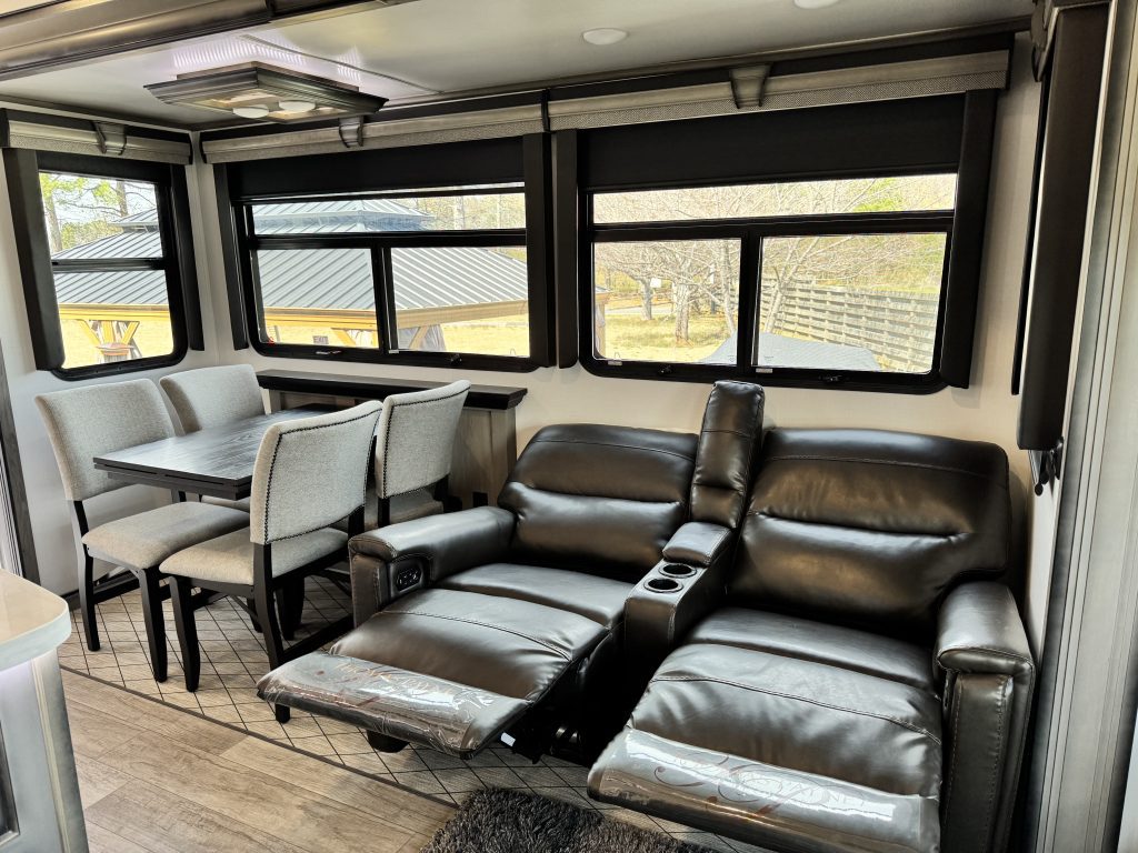 Like-new 2022 Keystone Montana 3855BR fifth-wheel RV for sale – asking $69,000. This luxury RV has only 61 towing miles and is in immaculate condition. The Montana 3855BR offers one of Keystone’s most popular layouts, featuring a spacious mid-bonus room with a built-in desk and sleeper sofa—perfect for a home office, guest room, or extra living space. The open-concept main living area includes theater seating, an electric fireplace, a large LED TV, and a full-sized sofa. The kitchen is fully equipped with solid surface countertops, a residential refrigerator, a gas cooktop, a convection microwave, and a large pantry. The king-sized primary suite features a large closet, plus a separate closet with washer/dryer hookups, and a beautifully designed bathroom with a spacious shower and single vanity. Additional highlights include an auto-leveling system, dual whisper-quiet A/C units, power awnings with LED lights, an outdoor kitchen, and generous pass-through storage. This RV comfortably sleeps up to 8 and offers residential-style comfort on the road or as a stationary home-away-from-home.